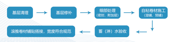 2.卷材接缝:卷材接缝采用冷自粘方式,撕去接缝自粘边的预留隔离带直接粘贴即可,形成完整密封的防水系统;
